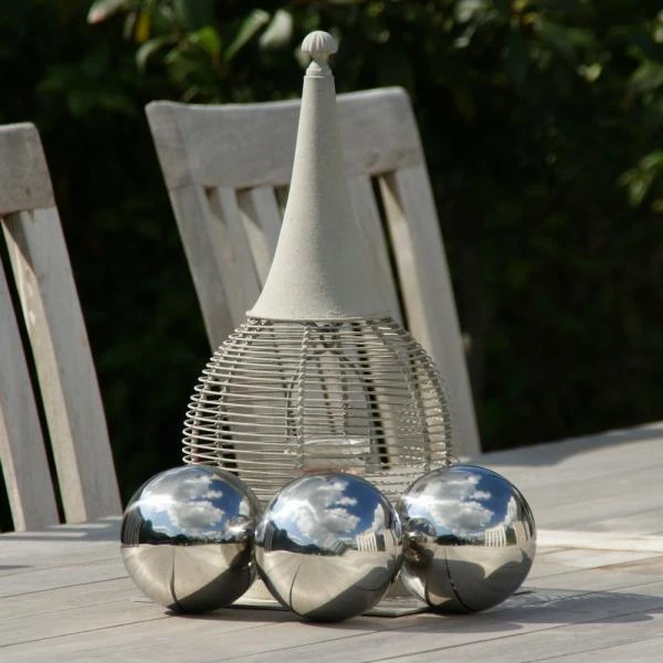 Reiger verjagen van vijver met blinkende ballen van RVS. Schitterende bollen voor op de vijver of in de tuin, maar eveneens zeer mooi als binnenhuisdecoratie.